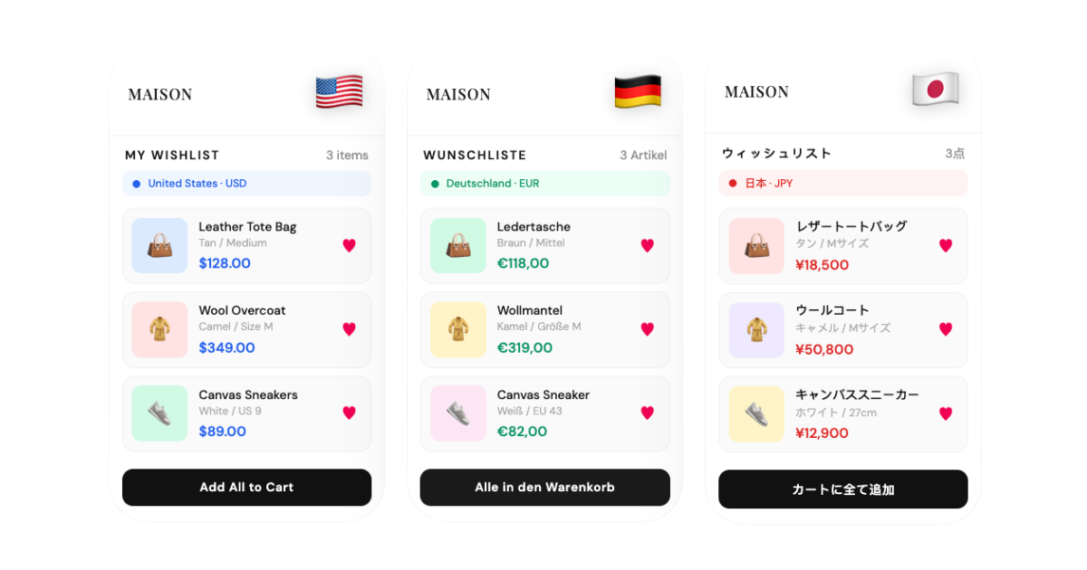 Shopify Markets solved the platform side of this headache by unifying global operations into a single store. However, for many brands, high-engagement tools like wishlists and back-in-stock alerts remained stuck in the old way of doing things. They often failed to recognize a shopper's specific currency, language, or regional availability.
